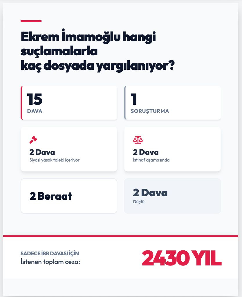 🔵 İmamoğlu’nun yargı süreçlerini; soruşturmaları, istenen cezaları, devam eden davalarını görselleştirdik.
