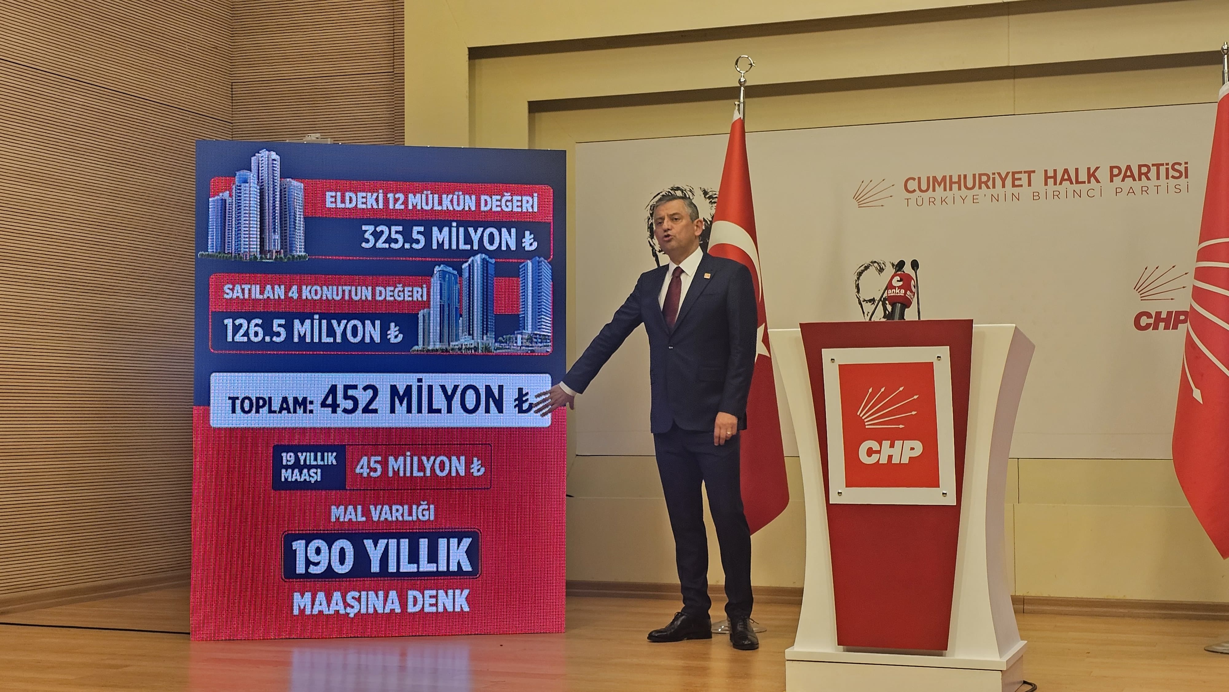 Gürlek’in devletten aldığı maaşı en yüksekten hesaplandığında 19 yılda toplam 45 milyon olduğunu söyleyen Özel, Gürlek’in malvarlığının “Mevcut taşınmazlarının ortalama değeri ve satılan mülklerinin toplam ortalama işlem hacmi 452 milyon lira.” olduğunu savundu.